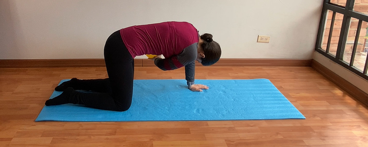 Colocar la pelota puede ser un juego divertido, una invitación es que se busquen diferentes maneras de hacerlo. El movimiento inicia con la conciencia que la espalda debe estar larga, aquí queremos trabajar esa independencia de la cadera para levantar levemente los muslos.